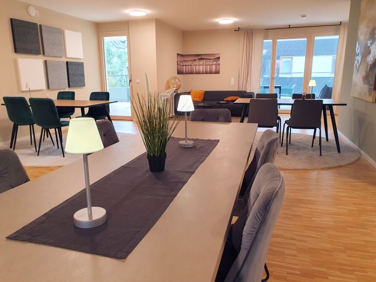 Der zentrale Wohn- und Essbereich zum Kontakte knüpfen, kochen, essen, lachen in gemütlicher Atmosphäre. Oder einfach nur chillen.